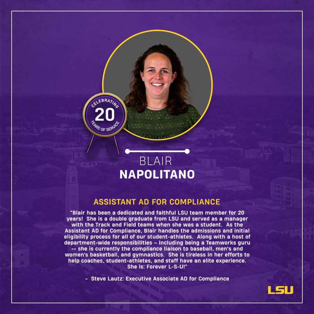 Blair Surpasses the 2-Decade Mark! Soul Mar 13 Written By Healthy Tiger Distinguished Service20 YearsBlair NapolitanoLSU ComplianceLSU Athletics Healthy Tiger